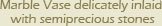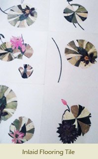 - Inlay of semi-precious stones and/or mother of pearl on any solid surface (such as marbles, building stones of various textures and colours, wood) to make a pattern that can be either traditional or contemporary.